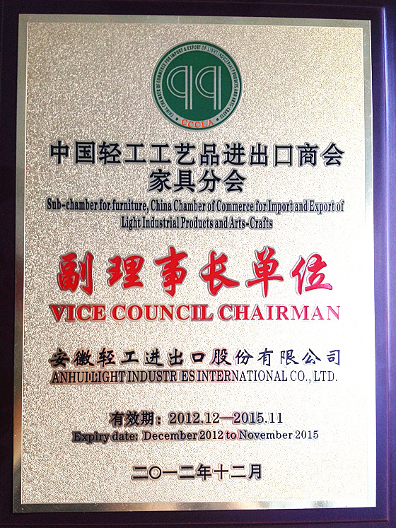 | 2013年07月 公司成為中國輕工工藝品進出口商會 家具分會副理事長單位。 |