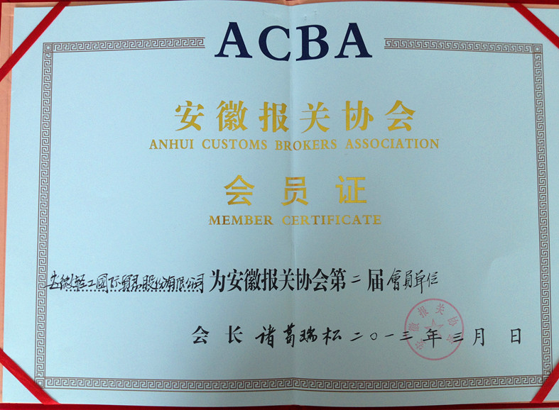 | 2014年05月 安徽報關協會為公司頒發會員證書 | ![]() |