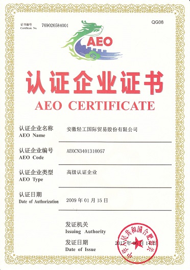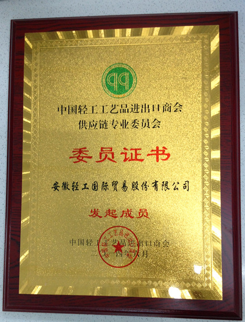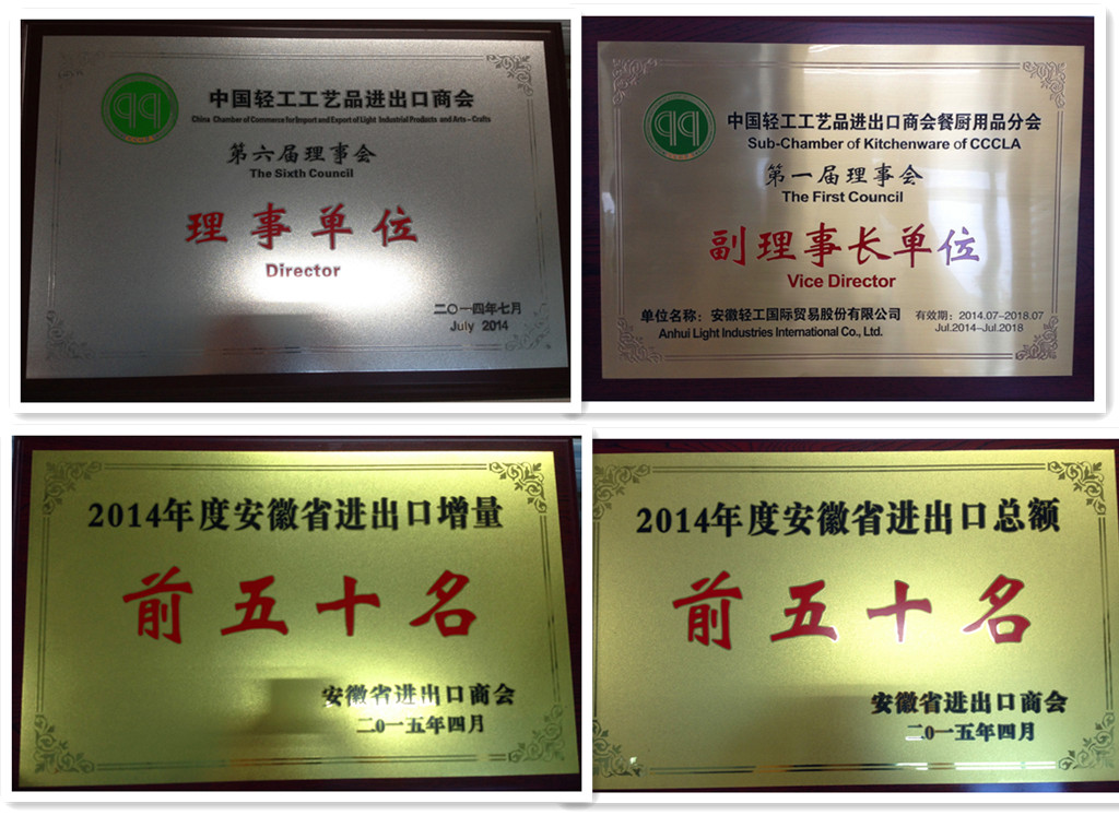 | 2015年05月 公司成為輕工工藝品進出口商會第六屆理事會理事單位、餐廚用品分會第一屆理事會副理事長單位,公司榮獲2014年度安徽省進出口增量前五十名、進出口總額前五十名 | ![]() |