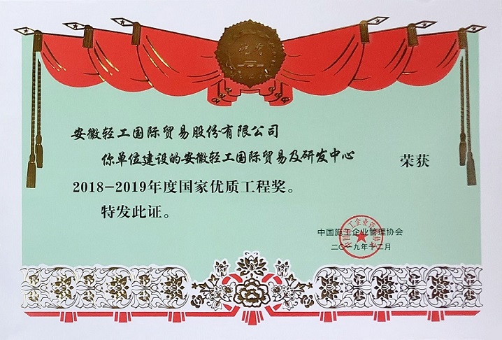 | 2019年12月,公司新大樓項目“安徽輕工國際貿易及研發中心”榮獲2018-2019年度國家優質工程獎。 | |