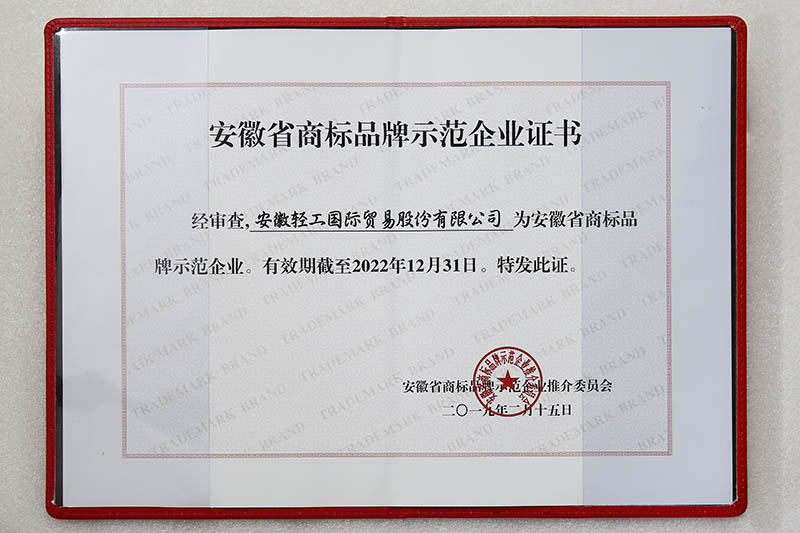 | 2019年3月,公司榮獲“安徽省商標品牌示范企業”榮譽稱號。 | ![]() |