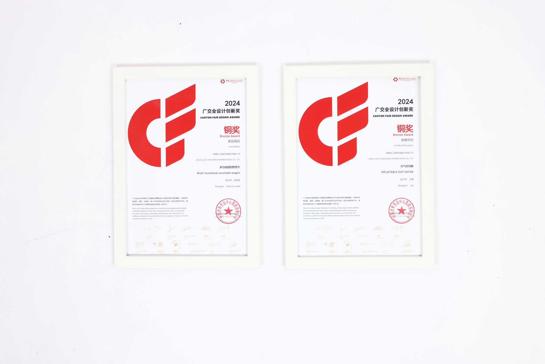 | 2024年9月 公司自主設計研發的“充氣皮劃艇”與“多功能遮陽野營車”兩款創新產品雙雙斬獲2024年廣交會設計創新獎銅獎。 | ![]() |