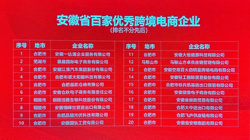 公司榮獲“安徽省跨境電商企業(yè)20強”,公司及合肥大中均被列入“安徽省百家優(yōu)秀跨境電商企業(yè)名錄”。