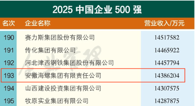 9月15日,中國企業聯合會、中國企業家協會發布“2025中國企業500強”。這份榜單以2024年企業營業收入為入圍標準,入圍門檻較上年提高5.79億元,達到479.6億元。其中,海螺集團連續21年入圍,以14386204萬元營業收入排名第193位。